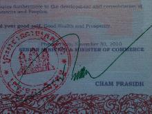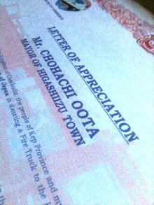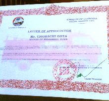 昨年に進呈していただきました緊急車輌のお礼に、カンボジア王国庶務大臣から感謝状が届ましたので、我がNPO法人カンボジアフューチャードリームメンバーの川上君が代わりに贈呈させていただきました。